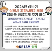 (중앙뉴스타임스 = 방재영 기자) 삼척시는 고향사랑기부제의 안정적인 운영과 지역경제 활성화를 위해 답례품 공급업체 추가 모집을 실시한다고 밝혔다. 신청 자격은 삼척시에 주소를 둔 사업체로서 답례품 공급이 가능한 품목을 생산 또는 배송할 수 있는 업체이며, 통신판매업 신고가 필수다. 모집 품목은 삼척시에서 생산·채취된 농·수·축·임산물과 가공식품, 삼척시 자원을 활용한 공예품, 관광·서비스 상품 등이다. 접수는 2월 9일부터 11일까지 삼척시청 본관 2층 총무과 고향사랑팀에서 방문 접수로 진행된다. 제출서류는 참가신청서, 공급제안서 등이며, 자세한 구비서류 목록은 삼척시 누리집을 참고하면 된다. 공급업체 선정은 서류심사와 필요시 현장평가를 거쳐 답례품선정위원회에서 최종 심의·결정하며, 결과는 2월 말 삼척시 누리집 공고와 함께 개별 통보할 예정이다. 시 관계자는 “지역 특산품과 관광자원을 활용한 다양한 답례품을 마련함으로써 기부자들의 선택 폭을 넓히고, 기부문화가 지역사회에 더욱 확산될 것으로 기대한다”며 “관심 있는 지역 업체들의 적극적인 참여를 바란다”고 말했다.