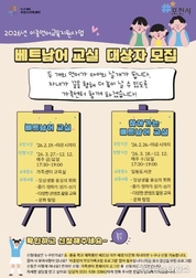 (중앙뉴스타임스 = 방재영 기자) 포천시 직영 ‘더 큰 행복 포천시가족센터’는 다문화 자녀의 이중언어 역량 강화를 위한 2026년 이중언어 교육지원사업 베트남 교실 수강생을 모집한다고 13일 밝혔다. 베트남어 교실은 다문화 자녀가 부모님의 모국어인 베트남어를 자연스럽게 습득하게 하여, 이중언어 강점을 가진 글로벌 인재로 성장하도록 돕기 위해 마련했다. ‘두 개의 언어, 두 배의 행복’이라는 슬로건 아래 진행되는 이번 교육은 학습자들의 접근성을 높이기 위해 센터와 일동도서관 두 곳에서 나누어 진행된다. 센터 내 교육실에서 진행되는 ‘베트남어 교실’은 3월 27일부터 12월 12일까지 매주 금요일 저녁 17시 30분부터 19시까지 운영되며, 현재 수강생을 모집 중이다. 일동도서관(1층 세미나실)에서 운영하는 ‘찾아가는 베트남어 교실’은 3월 18일부터 12월 12일까지 매주 수요일 저녁 17시 30분부터 19시까지 진행한다. 교육은 ▲발음 및 성조 훈련 ▲일상생활 중심의 회화 ▲듣기·말하기·읽기·쓰기 통합 학습 ▲다양한 콘텐츠 활용 교육 및 문화 탐험 등 아이들이 흥미를 잃지 않고 즐겁게 언어를 학습할 수 있는 체험 중심의 커리큘럼으로 구성했다. 대상은 초·중등