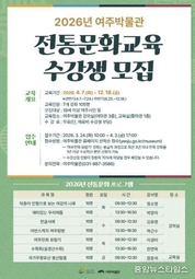 (중앙뉴스타임스 = 방재영 기자) 여주시 여주박물관은 오는 24일부터 ‘2026년 전통문화교육’ 수강생을 모집한다고 13일 밝혔다. 이번 교육은 4월 7일부터 12월 18일까지 상·하반기로 나누어 운영되며, 시민들이 우리 전통문화의 가치를 이해하고 다양한 문화예술 활동을 경험할 수 있도록 마련됐다. 운영 강좌는 ▲닥종이 인형으로 보는 여강의 나루 ▲재미있는 우리매듭 ▲한글서예 ▲어반스케치 여주탐방 ▲여주민화 유람기 ▲수묵화(실경산수화) ▲국가무형유산 봉산탈춤 등 총 7개 과정이며, 강좌별 15명씩 총 105명의 수강생을 모집한다. 특히 ‘여주민화 유람기’는 중급자 과정으로 운영되어 최근 3년 이내 민화 강좌를 1년 이상 수료한 시민을 대상으로 보다 심화된 교육을 제공한다. 수강 신청은 3월 24일 오전 10시부터 4월 3일 오후 5시까지 여주박물관 홈페이지를 통해 선착순으로 접수한다. 모집 대상은 19세 이상의 여주시민으로, 별도의 수강료 없이 무료로 운영되나 강좌별 재료비는 수강생이 직접 부담해야 한다. 박물관 관계자에 따르면 “이번 과정이 시민들에게는 전통문화의 가치를 깨닫고 예술인으로 성장하는 계기가 될 것”이라며, “앞으로도 시민들의 예술적 역량을 높