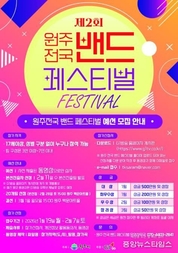 (중앙뉴스타임스 = 방재영 기자) 전국 밴드들의 열띤 경연이 펼쳐질 ‘제2회 원주 전국 밴드 페스티벌’ 예선 참가자 모집이 다음 달 7일까지 진행된다. 모집 대상은 전원 17세 이상으로 구성된 3∼7인조 밴드다. 참가를 희망하는 팀은 G1방송 홈페이지에서 지원서를 내려받아 작성한 뒤 이메일로 제출하면 된다. 올해 페스티벌은 2월 28일부터 3월 1일까지 2일간, 원주 백운아트홀에서 열린다. 예선을 거쳐 총 20팀이 본선에 진출하며, 진출팀 명단은 2월 11일 G1방송 홈페이지를 통해 공개될 예정이다. 시상은 대상 1팀 500만 원, 최우수상 1팀 200만 원, 우수상 2팀 각 100만 원, 장려상 3팀 각 50만 원으로, 상금과 함께 상장이 수여된다. 한편 지난해 열린 제1회 원주 전국 밴드 페스티벌 예선에는 총 186명이 참가해 전국 밴드들의 높은 관심과 열정을 확인할 수 있었다. 박혜순 원주시 문화예술과장은 “다양하고 실력 있는 밴드들이 참가해 원주를 음악으로 하나 되는 도시로 만들어 주길 기대한다”라고 말했다.