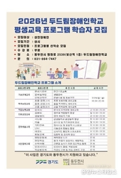(중앙뉴스타임스 = 방재영 기자) 동두천시가 장애인 평생교육 진흥을 위해 지원하고 있는 두드림장애인학교가 2026학년도 평생교육 프로그램 학습자를 모집한다고 13일 밝혔다. 기초문해, 학력보완, 직업능력교육 등 총 6개 유형의 20개 프로그램을 진행하며, 수강료는 무료이고, 학습자 모집은 연중 상시이다. 두드림장애인학교는 교육부에서 인정한 동두천시 유일한 학교 형태의 장애인 평생교육시설로, 2025년도에는 고졸 학력 검정고시 합격자를 배출하는 성과를 거뒀으며 각종 공연 활동에도 참여하는 등 장애인 학습자들이 사회 구성원으로 성장할 수 있도록 다양한 교육과 문화 활동을 지원하고 있다. 전청희 교장은 “앞으로도 장애인 학습자들이 배움에 대한 열정을 이어갈 수 있도록 다양한 교육 기회를 제공하는 데 최선을 다하겠다.”라고 밝혔다.