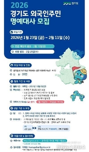 (중앙뉴스타임스 = 방재영 기자) 경기도가 오는 2월 10일까지 ‘경기도 외국인주민 대사’ 20명을 모집한다. 2023년 경기도 외국인 안전문화 명예대사로 출발한 ‘경기도 외국인주민 명예대사’는 도내 이주민을 대표해 도정에 능동적으로 참여하고, 행정과 이주민 커뮤니티를 잇는 핵심 소통 창구 역할을 수행한다. 경기도 외국인주민 명예대사로 선정되면 임기는 2026년 3월부터 2027년 12월까지이다. 이주민 대표자로서 ▲도정 및 외국인주민 관련 시책 자문 및 모니터링 ▲정책 워크숍 및 주제별 역량강화교육 이수 ▲정책 제안서 작성 및 회의 참여 등의 활동에 참여하게 된다. 모집 대상은 경기도에 1년 이상 거주하고 있는 성인 외국인주민으로, 귀화자를 포함한다. 이민사회 정책에 관심을 가지고 지역사회에서 이주인권 관련 활동을 희망하는 사람은 경기도이민사회통합지원센터 누리집을 통해 제출 서류를 내려받아 2월 10일 오후 5시까지 전자우편으로 제출하면 된다. 도는 1차 서류심사와 2차 온라인 면접 심사를 통해 최종 합격자를 선발하고, 개별 안내할 예정이다. 윤현옥 경기도 이민사회정책과장은 “새롭게