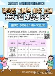 (중앙뉴스타임스 = 방재영 기자) 홍천군은 어린이들이 그림책 속 이야기를 더욱 즐겁게 만나고, 책과 연계한 보드게임과 미술 활동을 통해 마음껏 생각하고 표현하며 책과 한층 가까워질 수 있도록 돕고자 한다. 이를 위해 군은 2026년 상반기 홍천어린이도서관 '행복한 그림책 세상 교실' 프로그램 수강생을 모집한다. 접수 기간은 3월 20일까지이며, 홍천 어린이도서관 누리집 문화공간 프로그램 메뉴에서 선착순 온라인으로 신청할 수 있다. 프로그램은 ‘그림책 세상 생각 쑥쑥 보드게임’, ‘그림책 미술 놀이터’ 두 개 강좌로 운영한다. 홍천군 관계자는 “행복한 그림책 세상 교실 프로그램으로 어린이들이 그림책을 통해 상상력과 창의력을 키우고 놀이와 표현 활동으로 책 읽기의 즐거움을 자연스럽게 느낄 수 있도록 돕기 위해 마련했다”라며, “아이들과 보호자 여러분의 많은 관심과 참여를 바란다”라고 말했다.
