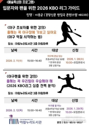 (중앙뉴스타임스 = 방재영 기자) 고양특례시 아람누리도서관은 오는 2월 11일과 12일 오후 3시부터 4시 40분까지 예술특성화 프로그램‘입문자와 팬을 위한 2026 KBO 리그 가이드’를 운영한다. 이번 프로그램은 2026시즌 KBO리그 개막을 앞두고 야구를 좋아하는 시민 및 입문자를 대상으로 야구 관람의 즐거움, 2026시즌 관전 포인트, 구단별 전력 분석 등을 소개하는 시간으로 기획됐다. 강연은 경향신문 기자이자 유튜브 '최강볼펜' 운영자 이용균 기자가 진행한다. 이용균 기자는 KBO 및 메이저리그 해설 경험과 다수의 야구 관련 저서 출간 경력을 보유하고 있으며, 기업·공공기관 대상 스포츠 강의 경험도 풍부하다. 2월 11일 강연에서는 ‘올해는 꼭 야구장에 가보고 싶어요’를 주제로 야구 입문 방법, 팀 선택 팁, 야구 관람 준비물, 전광판 읽는 법, 구단별 매력 포인트 등 첫 관람 입문자를 위한 실전 가이드를 제공한다. 2월 12일 강연은 ‘올해는 꼭 우리 팀이 우승해야 해’를 주제로 2026 KBO 리그 구단 전력 분석, 주목 선수, WBC 관전법, 코리언 메이저리거 전망 등 시즌 개막 전