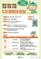 (중앙뉴스타임스 = 방재영 기자) 평택시는 관내 청년들의 취업역량 강화를 위해 추진 중인 ‘평택 청년 취업 성공 지원사업’의 5기 교육생을 10월 20일부터 11월 2일까지 모집한다고 밝혔다. 해당 사업은 구직 청년들이 취업 과정에서 가장 어려움을 겪는 자기소개서 작성 및 면접에 대한 교육 프로그램을 제공함으로써 구직 청년들의 취업역량 강화를 도모하는 사업으로 이번 교육이 2025년 마지막 교육과정이다. 5기 교육은 11월 5일부터 13일까지 2주 / 4회 (수, 목) 18:00~20:00 평택시 청년 지원센터 ‘청년쉼,표’에서 진행되며 △취업트렌드 및 공개채용 동향 파악 △입사지원서 작성법 및 직무역량 중심 에피소드 작성법 △면접 유형별 진행 방법 및 대응 전략 △면접 1분 자기소개 실습 및 인성 면접 시뮬레이션 △실전 모의면접을 진행하며 교육 기간 중 1:1 개별 온라인 컨설팅이 제공된다. 모집 대상은 평택시에 거주하거나 활동하는 19~39세 구직 청년으로 전 교육과정 참여 가능자 10명이며, 신청은 모집 포스터의 정보무늬(QR코드)에 접속하여 신청서를 제출하면 되고, 선정 결과는 11월 3일 개별 통보된다