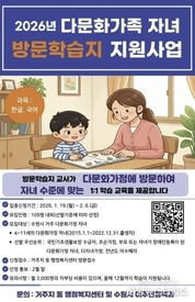 (중앙뉴스타임스 = 방재영 기자) 수원특례시가 다문화가족 자녀에게 한글·국어 방문학습을 지원하는 ‘2026 다문화가족 자녀 방문학습지 지원 사업’ 참여자를 2월 6일까지 모집한다고 22일 밝혔다. 다문화가족 자녀 방문학습지 지원 사업은 방문교사가 다문화가정을 방문해 자녀를 대상으로 한글·국어 중 한 과목을 교육하는 것이다. 일대일 수준별 학습지도를 해 아이들의 학습 능력을 높이고 한국어 능력 향상을 돕는다. 3월부터 12월까지 최대 10개월 동안 교사가 주 1회 방문해 교재를 제공하고, 학생 수준에 맞춰 15분가량 수업을 진행한다. 가정이 부담하는 수업료는 월 3000원이다. 수원시에 주소를 둔 4~11세(2015~2022년 출생) 다문화가족 자녀와 정규·대안 초등학교에 재학 중인 1~6학년 중도입국 자녀가 신청할 수 있다. 모집 인원은 105명 내외다. 모집 인원보다 신청자가 많으면 ▲국민기초생활보장 수급자 및 차상위계층 다문화가정 자녀(1순위) ▲한부모가정·조손가정·부모 또는 자녀가 장애인 등급 등록이 된 다문화가정 자녀·2자녀 이상 다자녀 가정(2순위) ▲전년도에 지원받지 않은 가정(3순위)을 우선으로 선발한다. 사업 참여를 원하는 다문화가정은 자녀의