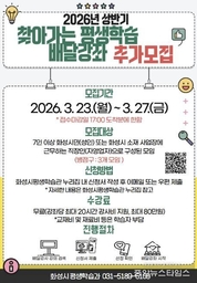 (중앙뉴스타임스 = 방재영 기자) 화성특례시는 시민의 다양한 학습 수요를 반영한 맞춤형 평생학습 프로그램 운영을 위해 ‘2026년 상반기 찾아가는 평생학습 배달강좌’를 추가 모집한다고 12일 밝혔다. ‘찾아가는 평생학습 배달강좌’는 시민이 원하는 학습 주제와 장소, 시간, 강사를 직접 선택해 운영하는 학습자 중심 프로그램으로, 시민들이 자발적으로 학습공동체를 구성해 참여할 수 있는 것이 특징이다. 이를 통해 시민들의 다양한 학습 욕구를 충족하고 평생학습 문화 확산에 기여할 것으로 기대된다. 이번 추가 모집은 3월 23일부터 3월 27일까지 진행되며, 화성시민(성인) 또는 화성시 소재 사업장에 근무하는 직장인으로 구성된 7인 이상의 학습모임이면 신청할 수 있다. 모집 규모는 병점권역 3개 학습모임이다. 선정된 학습모임에는 최대 20시간의 강사비가 지원되며 수강료는 무료다. 다만 교재비와 재료비는 학습자가 부담해야 한다. 강좌 운영 기간은 4월 13일부터 7월 3일까지다. 신청은 화성시 시민강사 통합정보시스템에 등록된 배달강사와 강좌 일정 및 계획을 사전에 협의한 후 신청서를 작성해 이메일 또는 화성시평생학습관으로 우편 제출하면 된다. 김향겸 평생학습과장은 “시