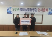 (중앙뉴스타임스 = 방재영 기자) 여주시 북내면 후계농업경영인회는 지난 20일 북내면 행정복지센터를 방문해 관내 어려운 이웃을 위한 이웃돕기 성금 100만 원을 전달했다. 이번 기탁은 회원들이 뜻을 모아 개최하는 연시총회를 앞두고, 지역사회의 소외된 이웃들이 따뜻한 새해를 맞이하기를 바라는 마음에서 진행됐다. 북내면 후계농업경영인회는 매년 잊지 않고 어려운 이웃을 위한 성금을 기탁하며 지역사회의 귀감이 되고 있다. 전달된 성금은 경기사회복지공동모금회를 통해 북내면 내 저소득층 및 복지 사각지대 가구를 지원하는 사업에 사용될 예정이다.