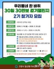 (중앙뉴스타임스 = 방재영 기자) 고양특례시 일산동구보건소는 지역 주민의 기초 체력 증진과 일상 속 신체활동 활성화를 위해 ‘우리동네 한 바퀴 30일 30만보 걷기 챌린지’ 2기 참가자를 오는 16일부터 모집한다고 11일 밝혔다. 이번 챌린지는 모바일 앱을 활용해 4월 한 달간 누적 걸음 수 30만 보 달성을 목표로 걷기를 실천하는 자발적 참여형 건강 증진프로그램이다. 참여 신청은 참가자의 대기시간을 단축하고 원활한 검사를 진행하기 위해 ‘사전 전화 예약제’로 운영한다. 참여 희망자는 전화신청으로 방문 날짜를 예약하고 고양시민건강센터 중산으로 방문하면 된다. 참가자들은 챌린지 전·후로 체성분 측정을 통해 체중, 골격근량, 신체 점수 등 자신의 건강 지표 변화를 객관적으로 확인할 수 있다. 또한 30일간 목표를 걸음수를 달성한 참여자에게는 건강 관리를 독려하기 위한 소정의 성공 기념품도 제공될 예정이다. 보건소 관계자는 “이번 챌린지를 통해 시민들이 일상 속 걷기의 가치를 재발견하고, 자기 주도적으로 건강을 관리해 나가는 소중한 출발점이 되길 바란다”고 말했다. 챌린지는 선착순 접수로 조