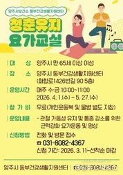 (중앙뉴스타임스 = 방재영 기자) 양주시보건소 동부건강생활지원센터가 중·장년층의 관절염 및 낙상 예방을 위한 맞춤형 요가 프로그램인 ‘청춘유지 요가교실’ 1기 참여자를 모집한다고 11일 밝혔다. ‘청춘유지 요가교실’은 만 65세 이상 양주시 여성을 대상으로 하며, 참여 신청은 3월 11일부터 전화 또는 방문을 통해 접수할 수 있다. 1기는 4월 1일부터 5월 27일까지 매주 수․금요일 총 16회 운영되며, 오전 10시부터 11시까지 진행된다. 프로그램은 관절 및 전신 가동성 유지와 낙상 예방을 위한 요가 운동, 세라밴드를 활용한 근력 강화 운동 교육 등으로, 참여자들이 가정에서도 지속적으로 운동을 실천할 수 있도록 구성됐다. 양주시 관계자는 “요가와 근력 운동을 통해 관절염 예방과 근력․유연성․균형감각 향상에 도움이 되길 기대한다”며 “앞으로도 시민 건강 증진을 위한 다양한 프로그램을 운영해 나가겠다”고 전했다.