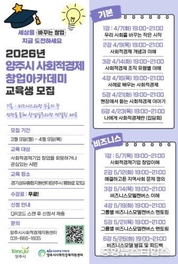 (중앙뉴스타임스 = 방재영 기자) 양주시와 양주시사회적경제지원센터가 지역 내 사회적경제 인식을 확산하고, 사회적경제 교육을 통한 예비 창업가·사회적경제 분야 인력양성을 하기 위해 ‘2026년 양주시 사회적경제 창업아카데미 기본·비즈니스 과정’ 교육생을 오는 4월 9일까지 모집한다고 11일 밝혔다. ‘사회적경제 창업아카데미’는 사회적 가치 실현을 목표로 하는 사회적경제 조직을 발굴·육성하고 지역사회 문제해결에 기여 할 인재를 양성하기 위한 교육 프로그램이다. 이번 교육은 사회적경제에 관심 있는 시민과 예비 창업자를 대상으로 진행되며, 전반적인 개념 이해부터 비즈니스 모델 설계까지 단계적으로 학습할 수 있도록 구성됐다. 기본과정은 4월 7일부터 4월 23일까지 6차시(총 12시간)로 운영되며 ▲지속가능한 발전의 사회적경제 ▲사회적경제 개념과 이해 ▲사회적경제조직 유형별 이해 ▲사례로 배우는 사회적경제 ▲선배 기업가에게 듣는 사회적경제 이야기 ▲집담회(나에게 사회적경제란) 등 사회적경제 전반에 대한 이해를 돕는 내용으로 진행된다. 비즈니스 과정은 5월 7일부터 26일까지 6차시(총 12시간)로 운영되며 ▲사회적경제기업 창업의 이해 ▲지역사회문제 정의 ▲비즈니스모델