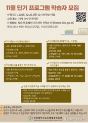 (중앙뉴스타임스 = 방재영 기자) 인천시교육청평생학습관은 오는 11월 운영되는 단기 프로그램의 수강생을 모집한다고 22일 밝혔다. 이번 프로그램은 AI(인공지능)·디지털 활용 능력 강화와 인문소양 증진을 주제로 시민들이 짧은 기간 내 배움을 얻을 수 있도록 기획됐다. 운영 강좌는 ▲스마트폰영상편집2 ▲AI(인공지능)와 함께 만드는 그림책2 ▲AI(인공지능)를 활용한 작사·작곡하기2 ▲(시니어) 연말연시는 숏츠와 함께 영상 카드 만들기 ▲한국미술 시대를 잇다: 전통에서 발견하는 현대 등 5개다. 디지털 역량 강좌 4개는 급변하는 환경에 대응해 시민의 정보 활용 능력을 높이는 데 중점을 두었으며, 인문교양 강좌는 전통과 현대미술을 잇는 인문학적 접근을 통해 문화 감수성을 높이는 기회를 제공한다. 수강 신청은 10월 23일 오전 10시부터 평생학습관 누리집에서 가능하며, 자세한 사항은 공지사항에서 확인하거나 평생교육부로 문의하면 된다.