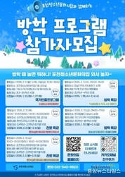(중앙뉴스타임스 = 방재영 기자) 포천시청소년재단이 운영하는 포천청소년문화의집은 청소년들의 진로 탐색과 창의 역량 강화를 위한 겨울방학 프로그램 참가자를 모집한다고 20일 밝혔다. 이번 프로그램은 실습 중심의 진로 콘텐츠와 안전성·교육 효과가 검증된 국가인증프로그램으로 구성됐다. 주요 프로그램으로는 ‘애완동물먹이지도사 과정’, ‘제과제빵사 과정’, ‘키자니아’, ‘잡월드’ 등에서 진행하는 진로 체험형 과정 등이 운영되며, 청소년들이 다양한 직업 세계를 직접 경험할 수 있도록 기획됐다. 프로그램은 2026년 2월 2일부터 13일까지 포천청소년문화의집과 각 활동처에서 진행되며, 초등학생부터 중·고등학생까지 참여할 수 있다. 일부 프로그램은 무료로 운영되며, 진로 특강과 직업 체험 과정은 소정의 참가비가 있다. 참가 신청은 프로그램별 일정에 따라 2월 초까지 포천청소년문화의집 누리집을 통해 선착순으로 신청 가능하다. 프로그램 세부 내용과 신청 방법은 누리집에서 확인할 수 있으며, 기타 문의는 전화로 하면 된다.