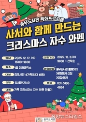(중앙뉴스타임스 = 이광운 기자) 김포시 풍무도서관에서 연말을 맞아 ‘사서와 함께 만드는 크리스마스 자수 와펜’을 오는 12월 17일 오후 4시부터 6시까지 운영한다. 이번 프로그램은 풍무도서관 특화 담당 사서가 직접 진행하며, 가족 단위 맞춤형 체험 활동이라는 점에서 큰 의의가 있다. 김포시민 가족을 대상으로 30분 단위로 예약을 받아 각 팀이 독립적으로 작업할 수 있는 환경을 제공한다. 참여자들은 스스로 선택한 디자인으로 나만의 자수 와펜을 만들고 완성된 작품을 각자 실생활 소지품에 부착해 활용할 수 있다. 12월 3일 오전 10시부터 풍무도서관 홈페이지에서 참여 신청할 수 있으며, 김포시민 가족 4가족(최대 16명)을 선착순으로 모집한다.