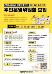 (중앙뉴스타임스 = 이광운 기자) (재)광주시문화재단은 광주시 생활문화센터(만선·광남·고산·신현)에서 2026년에 활동할 주민운영위원회 위원을 통합 공개 모집한다고 밝혔다. 광주시문화재단은 2023년도 만선·광남 생활문화센터를 개관하고 주민운영위원회를 구성하고 운영해 왔다. 이번 모집은 작년 말 임기 만료와 개관으로 인하여 신규 모집이 필요한 광남·고산·신현 센터와 충원이 필요한 만선 센터가 함께 모집한다. 총 43명 구성을 계획하고 있으며, 광남·고산·신현 3개 센터는 각 12명, 만선 센터는 25년도 연임 위원을 제외한 7명을 충원한다. 참여 자격은 공고 모집일 기준 만 19세 이상으로 ▲ 관내 주민등록이 되어 있는 사람 ▲관내 소재 직장인 및 단체 종사자 중 하나에 해당하는 시민은 누구나 신청할 수 있다. 이전에 주민운영위원으로 활동했던 시민도 지원할 수 있으나, 신규 위원을 우선 모집한다. 선정된 위원은 2026년 2월부터 1년간 활동하며 1회 연임할 수 있다. 주민운영위원회는 생활문화센터의 지속 가능한 발전을 도모하기 위해 주민이 직접 생활문화 정책을 제안하고 실행하는 자치 대표기구이다. ‘우리 동네