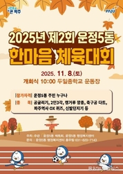 (중앙뉴스타임스 = 이광운 기자) 파주시 운정5동은 오는 11월 8일 토요일 두일중학교에서 녩년 제2회 한마음 체육대회’를 개최한다. 이번 행사는 운정5동체육회와 운정5동이 공동으로 주최·주관하며, 주민의 건강 증진과 화합을 도모하고, 활기찬 지역공동체 분위기를 조성하기 위해 마련됐다. 본 행사는 오전 10시 개회식을 시작으로, 남녀노소 누구나 참여할 수 있는 ▲공굴리기 ▲2인 3각 ▲캥거루 깡총 ▲파주 역사 퀴즈 등 다양한 게임 종목으로 구성되어 있다. 또한 ▲강재영 청소년 줄넘기 공연 ▲고고장구 공연 등 다채로운 무대과 경품 추첨 등 다양한 이벤트가 진행될 예정으로, 주민들이 함께 어울리며 즐거운 시간을 보낼 수 있을 것으로 기대된다. 권영분 운정5동 체육회장은 “이번 한마음 체육대회가 주민 모두가 함께 웃고 즐길 수 있는 화합의 장이 되길 바란다”라며 “다양한 프로그램과 축하공연을 즐기며 가족들과 함께 많은 참여를 부탁드린다”라고 전했다.