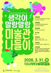 (중앙뉴스타임스 = 이광운 기자) 여주세종문화관광재단은 유아를 대상으로 하는 미술관 교육프로그램 '생각이 말랑말랑, 미술관 나들이'를 오는 4월부터 10월까지 아트뮤지엄 려에서 운영한다고 24일 밝혔다. '생각이 말랑말랑, 미술관 나들이'는 애니메이션 감상을 시작으로, 전시실 관람과 미술 활동으로 이어지는 세 단계 구성으로 운영된다. 먼저 미술관에서 직접 만든 애니메이션을 통해 미술관이 어떤 공간인지를 쉽고 재미있게 배운 뒤, 전시실에서 실제 작품을 감상한다. 이후 생각을 키워주는 활동지와 미술 체험을 진행하며, 아이들이 작품에서 받은 영감을 직접 표현해 볼 수 있도록 이끈다. 프로그램은 매주 화요일과 수요일 오전 10시부터 11시까지 1일 1팀으로 진행된다. 어린이집과 유치원 단체라면 누구나 무료로 참여할 수 있으며, 참가를 원하는 단체는 여주세종문화관광재단 홈페이지를 통해 3월 31일부터 신청하면 된다. 교육비는 전액 무료이며, 자세한 사항은 아트뮤지엄 려로 문의하면 된다. 이순열 여주세종문화관광재단 이사장은 “여주의 자라나는 희망인 어린이들이 미술관을 방문하며 미술관을 친숙한 공간으로 인식하고 문화예술을 자연스럽게 체득하길 바란다.”며 “미술관 아트뮤지