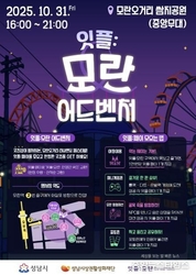 (중앙뉴스타임스 = 이광운 기자) 성남시상권활성화재단은 오는 31일 오후 4시부터 9시까지 중원구 성남동 모란오거리 쌈지공원 중앙무대(성남대로 1148번길)에서 ‘잇플:모란 어드벤처’를 연다. 이번 축제는 ‘골목이 하나의 놀이동산이 되는 순간’을 주제로, 모란오거리 일대를 탐험형 어드벤처 공간으로 꾸며 시민이 즐겁게 참여하며 지역의 새로운 매력을 느낄 수 있도록 기획된 체험형 행사다. 행사장은 지하철 8호선 모란역 2번 출구 인근에 위치해 접근이 편리하며, 상인과 시민이 함께 어우러지는 다양한 체험 프로그램이 펼쳐진다. ‘잇플:모란 어드벤처’에는 전국 최초 시민 참여형 상권활성화 프로그램인 ‘힙스토어 오디션’에 참여한 모란오거리 상인과, 성남시 청년상인 지원사업에 참여한 도담길 상인들로 구성된 ‘모란 크루’가 참여해 개성 넘치는 팝업스토어를 운영한다. 시민들은 이곳에서 로컬 브랜드 제품을 체험하고 구입할 수 있다. 축제는 △놀이공원 분위기 속에서 야장을 즐길 수 있는 ‘어드벤처 존’ △‘모란 크루’의 팝업스토어와 굿즈샵이 펼쳐지는 ‘아일랜드 존’ △모란오거리 골목 구석구석 숨은 보물 같은 가게를 탐험하는 ‘원더랜드 존’으로 구성되어, 남녀노소 누구나 즐길 수