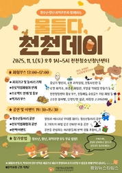 (중앙뉴스타임스 = 이광운 기자) 수원시청소년청년재단(이사장 최종진) 천천청소년청년센터는 청소년들의 꿈이 물드는 11월 1일 오후 1시부터 5시까지, 청소년·청년 및 주민이 함께하는 지역축제 ‘2025. 물들다, 천천데이’를 개최한다고 26일 밝혔다. 센터 소속 자치기구 및 동아리가 주도적으로 기획하고 운영하는 체험부스, 먹거리 부스, 공연 등 다채롭게 축제를 구성하여 깊어가는 가을에 풍성하고 즐거운 경험을 선사할 예정이다. 세부적으로 ▲먹거리 체험(3개), ▲활동 체험부스(13개), ▲댄스 및 마술공연(3개) 등이 진행된다. 천천청소년청년센터 관계자는 “센터 소속 자치기구 및 동아리 친구들이 직접 기획하고 운영하는 행사인 만큼 이번 축제를 통해 지역 구성원들이 한자리에 모여 함께 즐기고 어울리는 시간을 갖게 되길 기대하며, 더 나아가 센터가 건전하고 활력있는 지역문화 조성에 기여하는 기회가 되기를 바란다.”고 전했다. 보다 자세한 내용은‘수원시청소년청년재단’홈페이지 또는 천천청소년청년센터로 문의하면 된다.