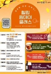 (중앙뉴스타임스 = 이광운 기자) 광명시 인생플러스센터가 오는 11월 12일부터 20일까지 신중년의 정서적 힐링과 문화 감수성 향상을 위한 ‘일상에 감성 더하기! : 힐링 원데이 클래스’를 운영한다. 이번 프로그램은 광명시인생플러스센터 교육장에서 진행하며, 정규과정 외에도 부담 없이 참여할 수 있는 체험형 교육으로 구성해 바쁜 일상 속 쉼표가 필요한 신중년에게 정서적 회복과 활력을 전하고자 마련했다. 총 4개의 교육으로 구성된 특강은 ▲따끈따끈 팥 온열팩(11월 12일) ▲차(茶) 블렌딩&티백 만들기(11월 14일) ▲아로마 명상테라피(11월 17일) ▲와인 테이스팅(11월 20일) 등으로 진행한다. 모집 대상은 50세부터 64세까지의 광명시 신중년이며, 10월 27일부터 11월 2일까지 선착순 모집한다. 잔여석이 있을 경우 11월 3일부터 7일까지 진행하는 추가 모집 기간에 한해 40~49세 광명시 중장년도 신청할 수 있다. 신청은 광명시 평생학습 통합플랫폼 ‘광명e지’에서 선착순 75명을 온라인 접수하며, 수강료 5천 원을 결제해야 신청이 완료된다. 박승원 광명시장은 “