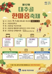 (중앙뉴스타임스 = 이광운 기자) 수원시 장안구 조원1동 주민자치회와 조원1동 단체협의회는 오는 11월 1일, 지역 주민이 함께 어울리는 ‘제12회 대추골 한마음 축제’를 개최한다. 이날 행사는 오전 9시 40분 조조영화 ‘코코’ 상영을 시작으로, 주민자치 프로그램 참가자들이 그동안 갈고닦은 실력을 선보이는 작품 발표회, 주민들이 함께 참여하는 장기자랑 ‘내 꿈을 펼쳐라’, 지역가수 초청 공연, 명랑운동회 등 다채로운 무대가 이어질 예정이다. 또한 현장에서는 체험 부스, 먹거리 장터, 플리마켓 등 온 가족이 즐길 수 있는 다양한 즐길거리도 마련된다. 특히 건강관리협회 경기지부, 수원장안경찰서, 수원소방서 의용소방대, 수원복지피부과 등 여러 기관이 함께 참여 및 후원하여 지역 공동체가 함께하는 축제의 의미를 더할 예정이다. 목명균 조원1동 주민자치회장은 “누구나 와서 즐길 수 있는 축제의 장을 만들기 위해 열심히 준비했다”며 “대추골에서 펼쳐질 유쾌한 하루를 통해 마을의 활기와 무르익는 가을을 느껴보시길 바란다”고 말했다. 김옥영 조원1동장은 “이번 축제는 주민들이 직접 만들고 함께 즐기는 축제라는