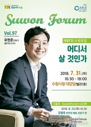 제97회 수원포럼 포스터.(제공=수원시) (수원=중앙뉴스타임스) 한홍주 기자 = 경기도 수원시는 오는 31일 오후 4시 30분 수원시청 별관 대강당에서 ‘어디서 살 것인가’를 주제로 제97회 수원 포럼을 연다. 포럼은 건축가 유현준 교수 강연으로 진행된다. tvN ‘어쩌다 어른’ , ‘알쓸신잡 2’ 등 다수의 방송프로그램을 통해 대중들에게 익숙한 유현준 교수는 연세대(건축공학), 미국 매사추세츠공과대학(건축설계), 하버드 대학원(건축설계)을 졸업했다. 2011년부터 홍익대학교 건축학과 교수로 재직 중이다. 저서로는 「현대건축의 흐름」, 「도시를 완성하는 73가지 건축 이야기」, 「도시는 무엇으로 사는가」 등이 있다. 이번 포럼에서 유 교수는 ‘내가 살고 싶은 곳은 어떤 곳일까’를 강연할 예정이다. 또 ‘양계장에서는 독수리가 나오지 않는다’ , ‘파라오와 진시황제가 싸우면 누가 이길까’ 등을 소주제로 흥미로운 이야기를 들려줄 예정이다. 앞으로 우리가 만들어 가야 할 도시에 대한 새로운 시각, 설계, 가치관도 공유한다. 한편 수원시는 ‘고품격 교육문화 도시’ 조성을 목표로 2010년 7월부터 매달 사회 각 분야 명사를 초청해 수준 높은 포럼을 개최하고 있다. 수