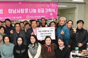 (중앙뉴스타임스 = 방재영 기자) 지난 4일, 하남시 가구산업협동조합(이사장 양귀술)이 연말을 맞아 지역 내 취약계층을 돕기 위해‘하남 사랑愛나눔’성품으로 라면 20개입 100박스, 백미 10㎏ 100포(총 485만원 상당)를 하남시에 기탁했다. 이날 기탁식에는 이현재 하남시장을 비롯하여 양귀술 이사장, 임철순 사무총장 등 회원 12명이 함께 참석했다. 하남시 가구산업협동조합은 70명의 조합원으로 구성된 하남시 유일의 가구조합으로서, 최근 진행한 사업의 수익금 중 일부를 지역사회에 환원하고자 성품을 마련했다고 전했다. 양귀술 이사장은 “우리 조합이 지역사회의 한 구성원으로 책임을 다하고자 이번 나눔을 준비했다”며, “앞으로도 지역과 함께 성장하는 나눔을 지속적으로 실천할 수 있도록 노력하겠다”라고 기탁 소감을 밝혔다. 하남시 관계자는 “지역사회를 위해 뜻깊은 나눔을 실천해준 하남시 가구산업협동조합에 감사드리며, 소중한 성품이 취약계층의 식생활 지원에 큰 힘이 될 것이다”라고 감사 인사를 전했다. 한편, 이번에 기탁된 성품은 하남시푸드뱅크를 통해 경제적 어려움을 겪는 어르신 등 취약계