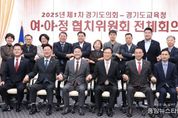 (중앙뉴스타임스 = 방재영 기자) 경기도의회와 경기도교육청은 5일 ‘2025년도 제1차 여야정협치위원회 전체 회의’를 열고 내년도 본예산에 경기교육의 발전과 미래를 위한 협치예산을 공동 추진하기로 합의했다. 김진경(더민주·시흥3) 의장과 임태희 도교육감, 더불어민주당 최종현(수원7) 대표의원, 국민의힘 백현종(구리1) 대표의원, 김진수 제1부교육감 등은 이날 의회 예담채에서 첫 여야정협치위원회 전체 회의를 열었다. 도의회·도교육청 여야정협치위원회는 ▲현장 중심의 학교 운영 강화, ▲교육행정 접근 체계 개선, ▲미래 교육을 이끄는 학습 전환, ▲안전하고 효율적인 교육환경 조성, ▲지역협력 기반의 맞춤형 교육 확대 등 5대 분야 2,000억원 규모의 협치예산을 공동 추진하기로 합의했다. 양 기관은 여야정 협치의 정신 아래 학생이 행복하고 교사가 존중받으며, 지역이 함께 성장하는 경기미래교육을 위해 협치예산의 효율적인 집행과 함께 지속적인 협력을 이어가기로 했다. 김진경 의장은 “경기도 학생들을 위한 교육 현안만큼은 여와 야, 의회와 집행부가 따로 있을 수 없다”라며 “아이들의 더 나은 미래를 위해 책임을 함께 짊어지고, 결과 또한 함께 만들어가겠다는 협력의 다짐