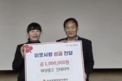 (중앙뉴스타임스 = 방재영 기자) 연천군 전곡읍에 소재한 태성광고 인테리어는 지난 11일 지역사회 어려운 이웃을 돕기 위한 성금 100만원을 경기 사회복지공동모금회를 통해 전곡읍지역사회보장협의체에 기탁했다. 이상훈 대표는 전곡읍지역사회보장협의체 민간위원장으로 활동하면서 지역의 사회보장 증진과 현장밀착형 사회복지 서비스 제공을 위해 다양한 사업을 추진하는 등 꾸준한 나눔과 기부를 통해 지역사회에 귀감이 되고 있다. 오릴리 전곡읍장은 “어려운 여건 속에서도 지속적인 기부와 봉사, 지역사회 나눔 실천을 위해 앞장서고 계시는 이상훈 위원장님께 감사드린다”며 “앞으로도 민관이 협력해 찾아가는 맞춤형 복지서비스 지원을 위해 최선을 다하겠다”고 밝혔다. 기탁된 성금은 사회복지공동모금회 전곡읍지역사회보장협의체 지정기탁금으로 적립돼 복지사각지대 가구 등 우리 주변의 어려운 이웃을 돕기 위한 협의체 특화사업에 소중하게 사용될 예정이다.