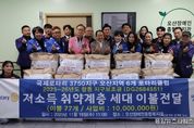 (중앙뉴스타임스 = 방재영 기자) 오산장애인종합복지관은 지난 19일 국제로타리 3750지구 오산지역 6개 로타리클럽의 합동 지구보조금 사업을 통해 1000만 원 상당의 겨울 이불을 후원받아 복지관 세탁지원서비스를 이용하고 있는 장애인 가정에 전달했다고 밝혔다. 이날 전달식에는 국제로타리 3750지구 오산지역 6개 로타리클럽과 오산시자원봉사센터 등 지역 내 관계기관이 함께 참여했다. 후원품은 오산시에 거주하며 세탁지원서비스를 이용하는 장애인 가정 77가구에 전달됐다. 특히 로타리클럽 회원들은 후원품을 단순히 전달하는 데 그치지 않고, 각 가정을 직접 방문해 겨울 이불을 전달하며 안부를 묻고 따뜻한 마음을 나누는 뜻깊은 시간을 가졌다. 성도규 오산장애인종합복지관 관장은 “국제로타리 3750지구 오산지역 6개 로타리클럽의 따뜻한 관심과 후원 덕분에 장애인 가정이 보다 따뜻한 겨울을 보낼 수 있게 됐다”며 “앞으로도 지역사회와 함께 다양한 나눔 활동을 지속적으로 확대해 나가겠다”고 말했다. 오산장애인종합복지관은 앞으로도 장애인 가정의 건강한 일상과 복지 향상을 위해 다양한 지원과 나눔 활동을 이어갈 계획이다. 한편, 오산정란로타리클럽을 비롯한 오산지역 6개 로타리클