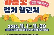 (중앙뉴스타임스 = 방재영 기자) 춘천시가 11월 한달 간 시민의 건강생활 실천을 돕기 위해 비대면 걷기 이벤트 ‘가을빛 걷기 챌린지’를 운영한다. 이번 챌린지는 춘천시 대표 걷기 프로그램인 ‘걸어봄, 내건강‘의 특별 이벤트로 일교차가 커지는 가을철에 줄어드는 신체활동을 보완하고 시민 누구나 일상 속에서 즐겁게 걷기를 실천하기위해 마련됐다. 참여방법은 간단하다. 모바일 앱 ‘워크온(WalkOn)‘에서 춘천시 커뮤니티에 가입한 뒤 공지천 의암공원에서 동내면 춘천자동차검사소 부근까지 이어지는 코스를 걸으면 된다. 코스에는 14개의 가상 스탬프가 설치돼 있으며, 6개 이상을 획득하면 챌린지 완주로 인정된다. 완주자 중 1,200명을 추첨해 모바일 춘천사랑상품권 5,000원 권을 증정한다. 춘천시 관계자는 “걷기는 특별한 장비나 비용 없이 누구나 시작할 수 있는 최고의 건강 습관”이라며 “맑고 선선한 가을바람을 맞으며 시민들이 즐겁게 걸을 수 있도록 많은 참여를 바란다”고 말했다.