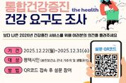 (중앙뉴스타임스 = 방재영 기자) 평택시 송탄보건소는 2026년 통합건강증진사업 계획수립을 위해 지역주민을 대상으로 건강요구도 설문조사를 진행한다고 밝혔다. 이번 조사는 지역사회 주민들의 만성질환 관리, 신체활동, 비만 예방관리 등 건강 관련 요구를 파악하여, 2026년 지역사회 통합건강증진사업 계획수립에 반영하기 위해 마련됐다. 설문 내용은 △보건소 건강증진사업에 대한 참여 경험 및 인식도 △건강증진을 위해 가장 필요하다고 생각하는 우선 사업 △생애주기별 보건사업 대상 우선순위 등 총 10개 문항으로 구성됐으며, 설문 결과는 2026년 통합건강증진사업의 세부 사업 발굴과 우선순위 설정을 위한 기초자료로 활용될 예정이다. 설문조사는 평택시와 보건소 누리집과 송탄보건소 카카오톡 채널(송탄보건소 건강정보톡!) 등에 게시된 정보무늬(QR코드)를 통해 온라인으로 진행되며, 설문조사에 참여한 주민을 대상으로 추첨을 통해 모바일 상품권을 제공할 예정이다. 송탄보건소 조민수 소장은 “이번 건강요구도 조사는 주민의 목소리를 직접 듣고 지역에 맞는 건강증진사업을 추진하기 위한 중요한 과정”이라며 “시민들의 적극적인