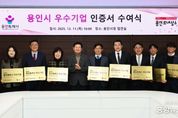 (중앙뉴스타임스 = 방재영 기자) 용인특례시는 11일 시청 접견실에서 ‘2025년 용인시 우수기업 인증제’ 심의 결과 선정된 ‘올해의 우수기업’ 10개 사에 인증서를 전달했다. 이상일 용인특례시장은 이들 기업 대표와 임직원들을 만나 축하와 격려 인사를 나누고 우수기업 인증서와 현판을 전달했다. 이상일 시장은 “우리 경제가 어려운 가운데서도 기업 활동을 잘 해주셔서 우수기업으로 선정된 것을 축하드린다”며 “각자 분야에서 그동안 많은 노하우를 쌓아왔기에 경제가 어려운 가운데서도 성과를 냈고, 우리 지역 경제에도 큰 보탬이 돼 주셔서 감사드린다”고 말했다. 이 시장은 “기업 활동으로 한 가족의 가장은 힘을 얻어 가정을 잘 꾸려갈 수 있고, 신규 일자리를 찾는 사람에게는 희망을 주셨다”며 “기업인들이 활동하실 수 있도록 환경을 잘 개선해 나갈 것”이라고 했다. 시는 매년 경영 실적, 기술·품질 경쟁력, 지역사회 기여도 등 다양한 지표를 종합 평가해 지역경제 발전에 기여한 중소기업을 우수기업으로 인증하고 있다. 올해 선정된 기업은 ▲㈜대성티엠씨 ▲신명이엔씨㈜ ▲주식회사 에이드로 ▲㈜에이치에스씨엠티 ▲주식회사 에코윈드 ▲이케이 주식회사 ▲㈜인스케이프 ▲주식회사 인투씨엔