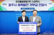 (중앙뉴스타임스 = 방재영 기자) 파주시는 코오롱글로벌㈜이 지난 26일 파주시 체육 발전을 위한 기부금 2천5백만 원을 전달했다고 밝혔다. 이날 행사에는 김경일 파주시장, 송승회 코오롱글로벌㈜ 부사장 등이 참석해 지역사회의 체육 기반 강화에 대한 상호 협력 의지를 확인했다. 코오롱글로벌㈜의 계열사인 코오롱스포렉스는 관내 6개의 스포츠센터를 위탁 운영하고 있으며, 전국적으로는 26개 운영 지점을 운영하고 있다. 40년간 축적한 체육시설 운영 경험을 바탕으로 공공체육시설 운영의 전문성을 높여 왔다. 송승회 코오롱글로벌㈜ 부사장은 “지역사회와 함께 성장하는 것이 기업의 중요한 책무”라며, “이번 기부를 계기로 파주시민의 체육 복지 향상에 더욱 힘쓰겠다”라고 말했다. 김경일 파주시장은 “해마다 체육 발전을 위해 기부금을 전달해 주셔서 감사드린다”라며, “기부금은 시민 생활체육 활성화, 청소년 체육 지원, 체육시설 확충 등 지역 체육 진흥을 위한 다양한 사업에 유용하게 활용하겠다”라고 말했다. 한편, 코오롱글로벌㈜은 매년 김장 담그기, 환경정화 활동, 사랑애(愛) 연탄 나눔 행사 등에 참여해 왔