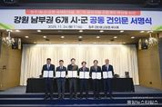 (중앙뉴스타임스 = 방재영 기자) 강원 남부권 6개 시군(원주·횡성·영월·평창·정선·태백)은 24일 호텔인터불고 원주에서 국토교통부의 ‘제7차 공항개발 종합계획’에 ‘원주(횡성)공항의 국제화 사업 반영’을 요청하는 공동 건의문을 채택했다. 이날 서명식에는 원강수 원주시장, 김명기 횡성군수, 이상호 태백시장, 최명서 영월군수, 심재국 평창군수, 최승준 정선군수 등 강원 남부권 6개 시군의 시장·군수가 모두 참석해 원주(횡성)공항 국제화 추진에 뜻을 모았다. 이번 공동 건의문 채택은 원주(횡성)공항 국제화가 침체된 강원 남부권 경제를 되살리고 공동 번영을 이끌 핵심 인프라라는 인식을 공유하고, 이에 대한 정부의 적극적인 지원과 조치를 요청하기 위해 마련됐다. 건의문의 주요 내용은 ①강원 남부권의 절실한 지역 현안과 새로운 돌파구 필요성 ②원주(횡성)공항의 경제적 파급 효과 ③국토교통부의 선제적 결단 촉구 등이며, 강원특별자치도를 통해 국토교통부에 전달될 예정이다. 원주(횡성)공항의 시설 개선으로 국제선 유치 여건이 갖춰지면, 강원 남부권 지역 경제 활성화는 물론, 수도권과 비수도권 간 격차 해소와 강원특별자치도 발전의 중요한 돌파구 확보가 기대된다. 한편 원주시