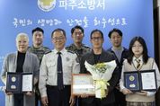 (중앙뉴스타임스 = 방재영 기자) 파주소방서는 3월 25일 오후 5시 소방서장 집무실에서 심정지 환자를 신속한 응급처치로 소생시킨 시민과 군인 등 유공자 6명에게 하트세이버 표창을 수여했다. 하트세이버는 '심장을 구하는 사람'이라는 뜻으로, 심정지 또는 호흡 정지 상태의 환자를 심폐소생술(CPR)과 자동심장충격기(AED) 등 신속한 응급처치로 소생시킨 이에게 수여하는 명예 표창이다. 이번 수여식은 긴박한 현장에서 투철한 시민정신으로 소중한 생명을 구한 공로를 기리고, 지역사회에 생명 존중 문화를 확산하기 위해 마련됐다. 지난해 파주 곳곳에서는 평범한 시민과 군인의 용기가 생사의 갈림길에서 기적을 만들어냈다. 6월 18일 새벽 2시경, 동패동의 한 자택에서 심정지 환자가 발생했다. 현장에 있던 박정연 양과 김바로·김유정 씨는 즉시 환자 상태를 확인하고 구급대가 도착할 때까지 응급처치를 이어갔다. 특히 중학생인 박정연 양은 평소 심폐소생술(CPR) 교육을 받은 경험을 바탕으로 침착하게 응급처치를 실시해, 출동 대원들 사이에서도 귀감이 됐다. 이튿날인 6월 19일 오전, 이번에는 금촌동 통일시장에서 시민