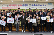 (중앙뉴스타임스 = 방재영 기자) 강원특별자치도는 29일 도청 별관에서 올 한 해 동안 자치행정 분야에서 탁월한 성과를 낸 유공자 및 우수부서에 대한 시상식을 개최했다고 밝혔다. 이날 시상식에는 혁신 실행과제, 도정 협업과제 ‘맞손잡기’, 일하는 방식 및 조직문화 개선, 자원봉사활동, 적극행정 등 자치행정분야 유공자와 우수부서 40여 명이 수상의 영예를 안았다. 혁신 실행과제에서는 강원특별자치도가 전국 최초로 시행한 ‘AI기반 공간정보시스템 구축(토지과)’ 등 6개 사업이 우수부서로 선정됐으며, 도정 협업과제 ‘맞손잡기’ 분야에서는 '기생충 방제 및 관리 강화를 통한 꿀벌 피해 최소화 사업(동물방역과)'이 최우수 사례로 선정됐다. 또한 일하는 방식 및 조직문화 개선 분야 최우수 부서로는 농업기술원 농촌자원과가 선정됐으며, 자원봉사활동 분야에서는 연간 755.5시간의 봉사활동을 수행한 지은희 주무관(농산물유통과) 등 5명이 우수공무원으로 선정됐다. 아울러 적극행정 유공 분야에서는 ‘강원 혜택이지’ 사업을 기획 단계부터 실행까지 성공적으로 이끈 박명철 주무관(지능정보정책과)이 최우수 공무원으로 선정됐으며, 소상공인과 소방관의 협업을 통해 화재 취약계층 주거시설