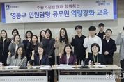 (중앙뉴스타임스 = 방재영 기자) 수원시 영통구는 지난 25일 영통구청 상황실에서 구청 및 12개 동 민원 담당 공무원을 대상으로 수원가정법원과 함께하는 역량 강화 교육을 실시했다. 이날 특별 초빙된 수원가정법원 박민숙 사무관과 유신임 행정관은 갈수록 복잡하고 다양해지는 가족관계등록사무를 개념부터 관련 법령까지 체계적으로 교육했으며, 업무처리 시 유용한 노하우 공유, 질의응답 등의 시간도 마련했다. 특히 실무에서 자주 접하는 기본적이고 중요한 사례 중심으로 민원 담당자들이 이해하기 쉽게 교육을 통해 실무의 어려움을 해소하고, 신속하고 정확한 업무 처리에 대한 자신감을 높였다. 장수석 영통구청장은“가족관계등록부는 국민의 신분과 정체성을 증명하는 유일한 공적 자료로, 직원들의 전문성 부족이 시민들의 불편으로 이어지지 않도록 수원가정법원과 함께 민원담당 공무원의 역량 강화에 최선을 다하겠다”고 밝혔다. 영통구는 앞으로도 직원들의 전문성과 자신감을 강화하여 수준 높은 민원행정 서비스를 실현해 나갈 계획이다.