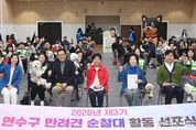 (중앙뉴스타임스 = 방재영 기자) 인천 연수구는 지난 21일 구청 대회의실에서 반려견순찰대 ‘연수지킴댕댕이’ 활동 선포식을 열고 3기 순찰대원을 공식 위촉했다. 2024년 연수구는 인천 기초자치단체 최초로 직영 반려견순찰대 운영을 시작했으며, 올해 3기를 추가로 모집해 서류 및 현장 심사를 거쳐 총 87팀을 위촉했다. 이날 행사는 위촉장 수여식 후, 민재연 수의사의 ‘안전한 순찰과 건강한 일상생활을 위한 반려견 운동 가이드’ 강좌와 반려견순찰대 기본 사항 및 순찰 방법에 대한 교육이 진행됐다. ‘연수지킴댕댕이’는 반려견과 함께하는 일상적인 산책을 통해 우리 동네 구석구석을 살피며 생활 불편 사항을 점검하고 펫티켓을 홍보한다. 순찰대는 야간 시간대 범죄취약지역을 중심으로 합동 순찰을 하고, 관내 공원에서 ‘펫티켓 홍보 캠페인’ 등을 추진할 계획이며, 구는 연말 순찰대 활동 사례 발표를 통해 우수 순찰대원을 표창할 예정이다. 반려견순찰대는 지난해 4월부터 9개월간 총 5,640회 순찰했으며, ▲112 신고 13건, ▲안전신문고 신고 130건 등 총 143건의 신고를 접수했다. 이재호 구청장은 “순찰대의 모범적인 활동을 통해 반려인과 비반려인 간의 갈등을 해소하고