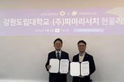 (중앙뉴스타임스 = 방재영 기자) 강원도립대학교와 재생의학 기반 바이오 제약 기업인 ㈜파마리서치(대표이사 손지훈)가 지역 혁신 성장을 주도할 전문 인재 양성을 위해 손을 잡았다. 강원도립대학교는 2월 4일 대학 본부에서 파마리서치와 ‘산학협력 업무협약 및 현물 기탁식’을 개최했다고 밝혔다. 이번 행사는 양 기관이 앞서 서면으로 체결한 산학협력 협약의 내용을 공유하고, 파마리서치 측에서 기탁한 현물을 전달하기 위해 마련됐다. 양 기관은 이번 협약을 통해 대학과 기업이 보유한 역량을 결합해 지역 맞춤형 인재 양성을 위한 현장 밀착형 교육 생태계를 구축하기로 뜻을 모았으며, 영동지역 청년 인재 채용 활성화 및 실무형 전문 인력 양성, 객관적 취업 정보 공유, 산학 공동발전을 위한 구체적인 협력 사업을 함께 펼칠 예정이다. 특히 파마리서치는 이번 MOU 체결을 기념해 학생과 교직원에게 1천만원 상당의 자사 대표 제품을 기탁하며 학생들의 건강한 도전과 성장을 응원했다. 강원도립대학교 최종균 총장은 “글로벌 바이오 기업인 파마리서치의 소중한 기탁과 협력 약속에 깊은 감사를 드린다”며 “대학 또한