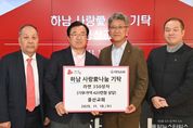 (중앙뉴스타임스 = 방재영 기자) 하남시는 24일 관내 백조현대B상가번영회에서 ‘하남 사랑愛나눔’성금으로 70만원을 기탁받았다고 밝혔다. 이날 기탁식에는 이현재 하남시장을 비롯하여 이성근 회장, 이강용 감사, 이문섭 총무가 참석했다. 백조현대B상가번영회는 지역사회 나눔 문화 확산과 취약계층 지원을 위해 2018년부터 지난 8년 동안 꾸준히 성금을 기부해왔다. 번영회는 올해에도 관내 어려운 이웃을 돕기 위한 성금을 전달하며 지역사회에 따뜻한 메시지를 전했다. 번영회 이성근 회장은 “성금은 45개 상가 회원들이 한마음으로 모은 정성이며, 따뜻한 마음이 관내 어려운 이웃들에게 잘 전달되길 바란다”고 기탁 소감을 밝혔다. 이현재 하남시장은 “오랜 기간 변함없이 지역사회 발전과 이웃돌봄에 앞장서는 백조현대B상가번영회에 깊은 감사를 전한다”며 “기탁된 성금은 도움이 꼭 필요한 이웃에게 신속하게 전달하겠다”고 말했다. 이날 기탁한 성금은 관내 복지사각지대에 놓인 취약계층 가구에 배분될 예정이다.