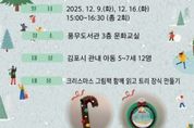 (중앙뉴스타임스 = 이광운 기자) 김포시 풍무도서관은 ‘사서와 함께하는 크리스마스 책놀이’프로그램을 12월 9일과 16일 오후 3시부터 4시 30분까지 운영한다. ‘사서와 함께하는 크리스마스 책놀이’는 풍무도서관 사서가 직접 운영하는 프로그램으로, 크리스마스를 주제로 한 도서를 함께 읽고 크리스마스 소품 만들기 활동을 통해 창의력과 표현력을 기를 수 있도록 구성됐다. 크리스마스 주제 도서로 ‘산타 할아버지의 첫 크리스마스’(맥 바넷 지음)와 ‘크리스마스에는 축복을’(김현철 지음)을 활용하고, 트리 장식 및 스노우볼 오너먼트 등 크리스마스 소품 만들기 시간을 가질 예정이다. 11월 25일 오전 10시부터 풍무도서관 홈페이지에서 참여 신청할 수 있으며, 김포시 관내 아동 5~7세 12명을 선착순으로 모집한다.