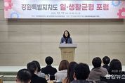 (중앙뉴스타임스 = 방재영 기자) 강원특별자치도는 17일 강원특별자치도와 강원특별자치도경제진흥원이 공동 주최하고, 강원특별자치도여성가족연구원과 강원여성새로일하기센터가 주관하여 강원특별자치도여성가족연구원 1층 강당에서 '강원특별자치도 일·생활균형 포럼'을 개최했다. 이번 포럼은 여성의 경력단절을 예방하고, 저출산 및 지역소멸 극복을 위해 지역사회 전반에 일·생활 균형 문화를 확산하기 위한 담론장으로 마련됐다. 포럼에서는 '강원특별자치도 일·생활균형 실태조사' 결과를 공유하고, 행정·기업·노동·지역 현장 등 다양한 주체가 참여한 토론을 통해 강원지역의 여건을 반영한 정책 방향과 실행 과제가 논의됐다. 좌장은 정구연 교수가 맡았다. 토론에는 박관희 강원특별자치도의원, 이지영 강원교통방송 편성국장, 남미영 한국여성경제인협회 강원지회 명예회장, 김재중 한국노동조합총연맹 강원도지역본부 의장, 박옥희 엔씨스마트컨설팅 대표(가족친화인증 평가위원), 윤수경 강원광역여성새로일하기센터 센터장, 유효숙 강원특별자치도 여성청소년가족과 팀장이 참여해 분야별 현장 경험과 제도 개선 의견을 공유했다. 정영미 강원특별자치도 복지보건국장은 “저출생·인구감소·지역소멸 대응을 위해 일·생활 균