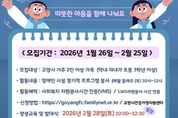(중앙뉴스타임스 = 방재영 기자) 고양특례시 건강가정지원센터에서는 오는 2월 25일까지 2026년 ‘가족봉사단’참여자를 모집한다. 가족봉사단은 고양시 건강가정지원센터에서 지속적으로 진행해온 사업으로, 가족단위 참여자들이 월 1회 봉사활동에 참여함으로써 가족 간, 이웃 간 마음을 나누는 사업이다. 참여 조건은 고양시에 거주하는 2인 이상 가족으로, 막내 자녀가 초등학교 3학년 이상이어야 한다. 2월 28일 일산서구청에서의 발대식을 시작으로, 3월부터 매월 둘째 주 토요일 관내 장애인시설인‘고양 천사의 집’에서 봉사활동을 진행할 예정이다. 신청은 센터 누리집(홈페이지)에서 가능하며, 봉사활동 참여자는 자원봉사시간 인증이 가능하다.