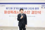 (중앙뉴스타임스 = 방재영 기자) 화성특례시의회는 26일 화성종합경기타운 3층 라운지홀에서 열린 제72회 경기도체육대회 화성시 선수단 결단식에 참석해 선수단을 격려하고 4연패 달성을 위한 결의를 다졌다. 이날 행사에는 배정수 의장을 비롯해 김종복 문화복지위원장, 송선영·이용운 의원, 화성시체육회 임원과 종목단체 관계자, 선수단 등 약 150여 명이 참석했다. 이날 결단식은 경기도체육대회 출전을 앞둔 선수단의 사기를 높이고 각오를 다지는 자리로 마련됐다. 화성특례시 선수단은 오는 4월 16일부터 18일까지 광주시 일원에서 열리는 제72회 경기도체육대회에 출전한다. 육상, 수영, 축구 등 27개 종목에 참가해 종합우승 4연패에 도전한다. 배정수 의장은 “묵묵히 쌓아온 훈련의 시간과 노력을 믿고 끝까지 당당하게 경기에 임해주시기 바란다”며 “선수 여러분의 땀과 투혼이 화성특례시의 자부심”이라고 말했다. 이어 “화성특례시의회도 선수들이 오직 경기에 집중할 수 있도록 체육 환경 조성과 지원에 최선을 다하겠다”며 “4연패 달성을 진심으로 기원한다”고 덧붙였다. 화성특례시의회는 선수들이