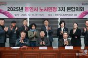 (중앙뉴스타임스 = 방재영 기자) 용인특례시는 17일 용인시노동복지회관에서 제3차 노사민정협의회 본협의회와 2025년 노사민정협의회 성과보고회를 열었다고 밝혔다. 이날 협의회엔 노사민정협의회 위원장인 이상일 시장과 노사민정협의회 위원들이 참석한 가운데 지역 노동 현안과 향후 노사민정 상생 협력 사업 방향 등을 논의했다. 이어 열린 성과보고회에선 노사상생 발전과 지역 노동 환경 개선에 기여한 유공자들에 대한 표창과 감사패 수여가 진행됐다. 노동자 권익 증진과 취약노동자 보호, 산업현장 안전 강화 등 노사상생 발전에 기여한 드림원 박단영 대표이사, 예송장애인가족협회 이원경 대표 등 10명이 표창을 받았다. 노사민정협의회 활성화와 지역 상생의 노사문화 정착에 기여한 공로로 오기환 고용노동부 경기지청장과 처인드리미 봉사단 등 5명이 감사패를 받았다. 이상일 시장은 “용인에 반도체 1000조 원 투자 시대가 열렸다”며 “저는 앞으로 투자가 1500조 원을 넘을 것으로 본다”고 말했다. 이 시장은 “SK하이닉스가 600조 원을 용인 반도체클러스터 일반산업단지에 투자하게 되는데, 이는 2023년 7월 국가첨단전략산업 특화단지로 지정됐기 때문”이라며 “이것이 기틀이 돼 ‘