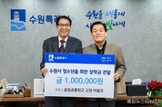(중앙뉴스타임스 = 방재영 기자) 이철규 효동초등학교 교장이 24일 수원시장학재단에 장학금 100만 원을 기부했다. 수원시청에서 열린 기부금 전달식에는 이재준 수원시장, 이철규 효동초등학교 교장 등이 참석했다. 이재준 시장은 이철규 교장에게 지역 교육 발전 유공 감사패를 전달했다. 이재준 시장은 “따뜻한 나눔을 실천해 준 이철규 교장 선생님께 감사드린다”며 “후원금은 수원시 청소년들이 더 밝고 건강하게 성장할 수 있도록, 지원하는 데 소중하게 사용하겠다”고 밝혔다. 이철규 교장은 “청소년들이 자신의 가능성을 발견하고 꿈을 키워갈 수 있으면 한다”며 “이 마음이 수원시 청소년들에게 따뜻한 힘이 되기를 바란다”고 말했다. 수원시는 2024년 12월 효동초등학교에 ‘청개구리 연못’을 개관했다. 수원시 ‘청개구리 연못 사업’은 학교 내 유휴 교실을 활용해 청소년과 학부모가 자유롭게 활동하고, 세대 간 소통과 교육 나눔을 할 수 있는 교육·문화 복합 공간을 조성하는 사업이다. 수원시는 청소년 문화시설이 부족한 지역에 청개구리 연못을 조성하고 있다. 효동초 청개구리 연못은 연면적 487.62㎡ 규모로 공감 쉼터와 소모임실 1·2, 밴드실 등을 갖췄다. 학교 교육 시간에